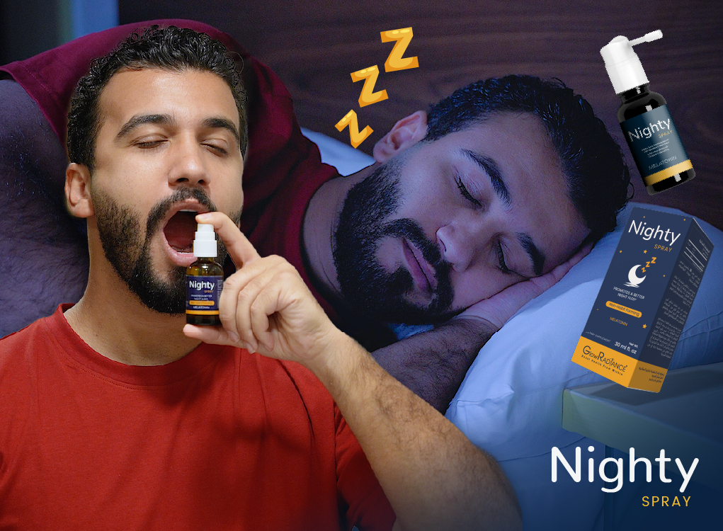GlowRadiance NIGHTY Spray is a quick and convenient solution for better sleep. Made with non-habit forming Melatonin, it helps regulate your natural sleep cycle and is ideal for insomnia, jet lag, or shift-work sleep issues. The sublingual spray format ensures fast absorption, making it perfect for those who have difficulty swallowing tablets.