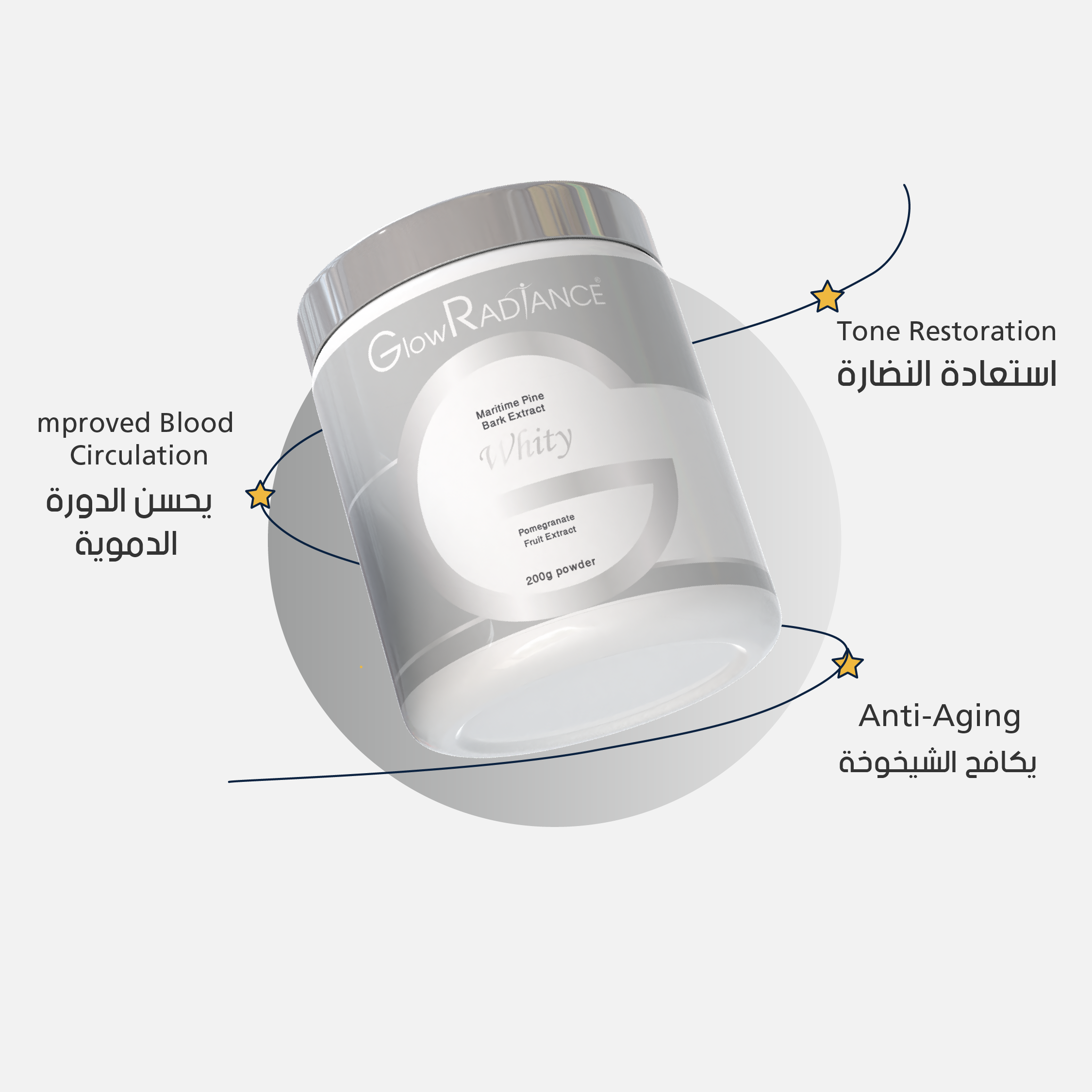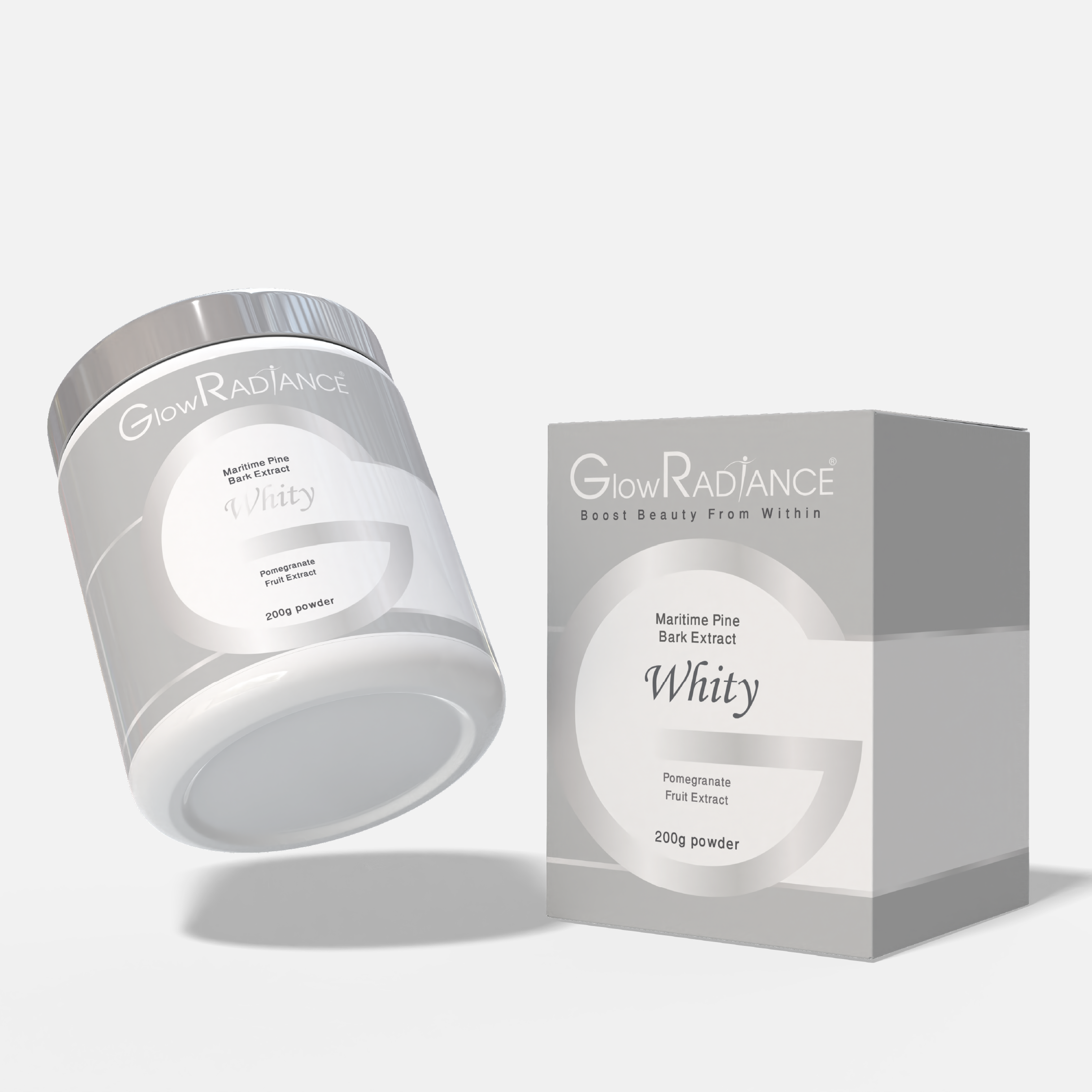 GlowRadiance Whity Powder is an advanced skin supplement that transforms dull, uneven skin into a radiant and luminous complexion. Formulated with clinically proven ingredients like Pycnogenol, Vitamin C, and Pomegranate Extract, it works from within to reduce pigmentation, improve skin tone, and protect against signs of aging.